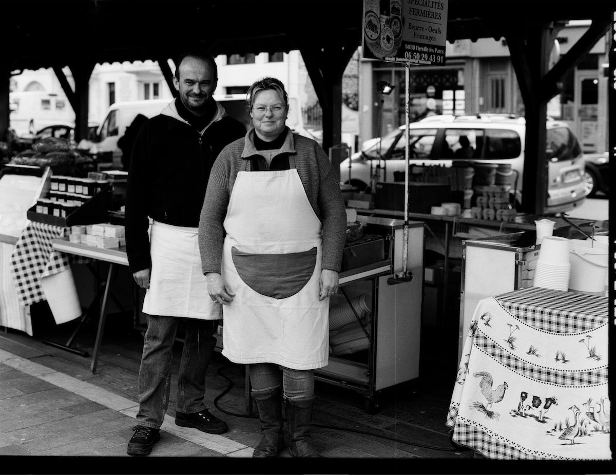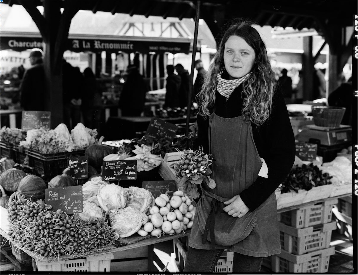 J’ai commencé à faire des portraits en noir et blanc, au marché même, argentique noir et blanc, moyen format, posés, traditionnels comme j’avais prévu de les faire malgré le peu de temps qu’ils avaient à me consacrer, happés par leur clientèle. Et j’ai eu envie de prolonger ces moments, de retrouver certains de ses personnages chez eux, d’aller voir où ils vivaient dans leurs champs et leurs serres, dans leur campagne et dans leur ferme, et de transmettre la poésie de leur métier.